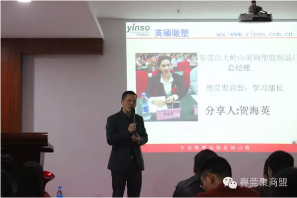 接下來周俊鋒會長給新朋友們介紹了“粵莞聚商盟”組織的由來,以及組織“愿景與使命”,拋磚引玉今天分享的第一個主題,并且隆重的介紹我們英碩吸塑總經(jīng)理,粵莞聚商盟副會長兼學(xué)習(xí)部長賀海英登臺分享。