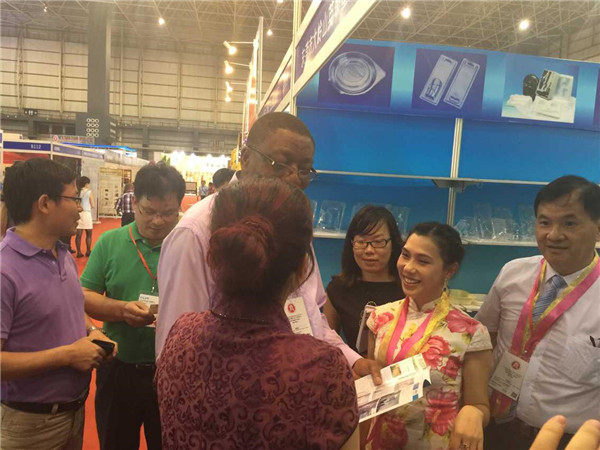圖為東莞英碩吸塑廠總經(jīng)理賀小姐在展會上跟外國客戶介紹我們的吸塑包裝盒。