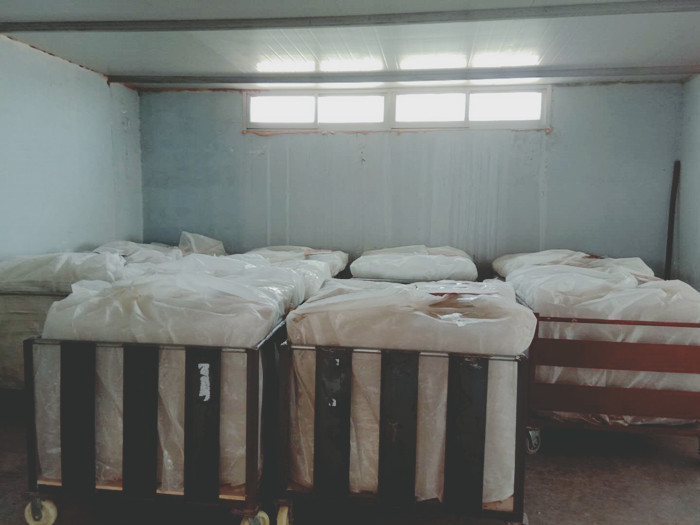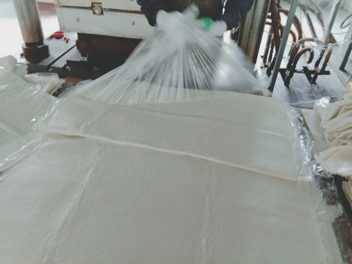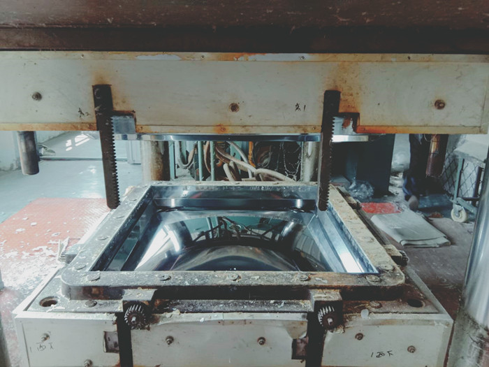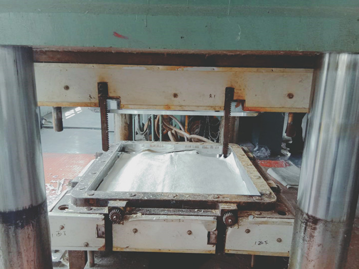 經(jīng)過熟化期的片材就可以放入模壓機進行模壓了,在模壓之前要嚴格稱重每塊水箱板需要的片材重量,以每塊水箱板都是標(biāo)準(zhǔn)重量。進入模壓機之前還要把包裹片材的塑料膜撕下,才能放入模壓機。