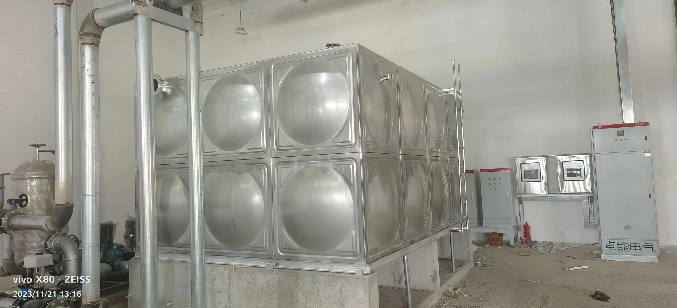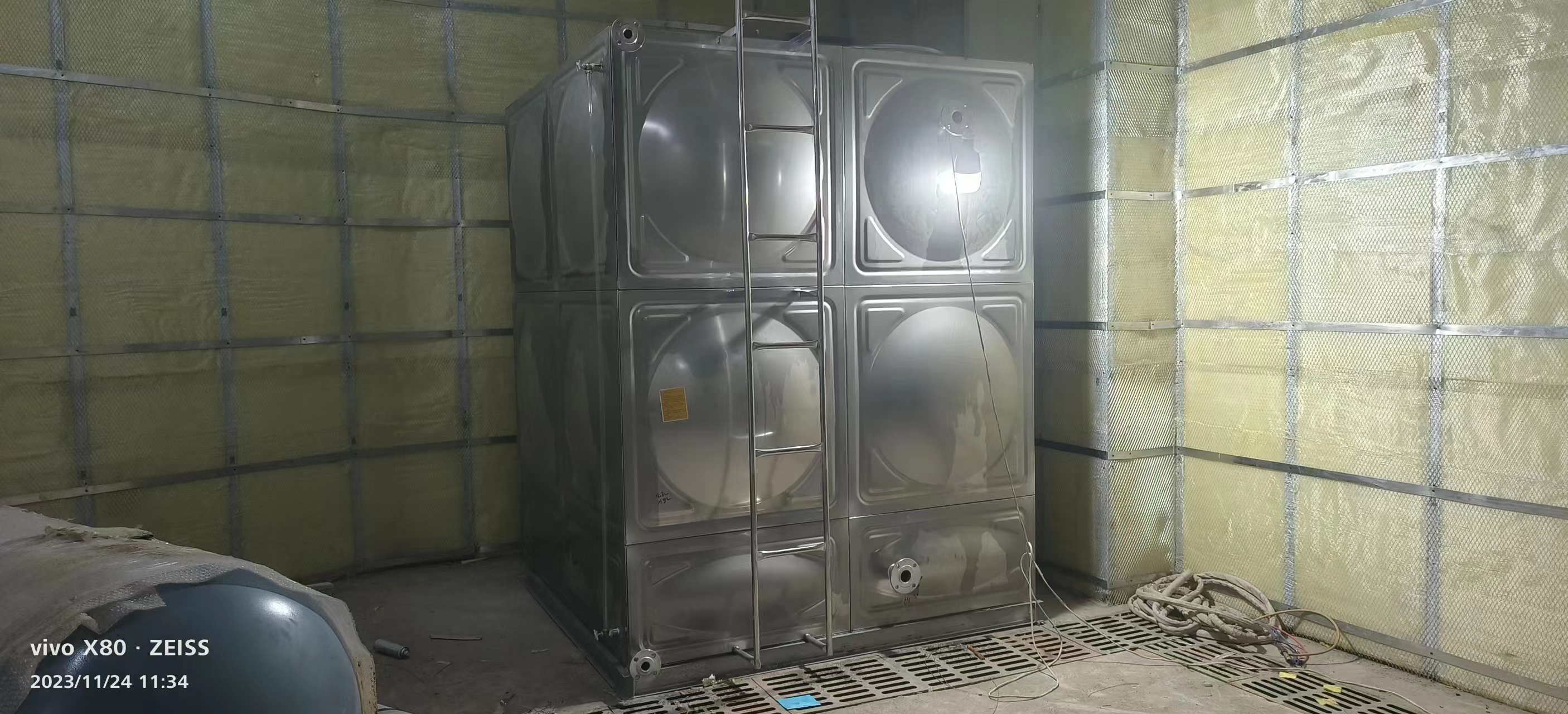我廠承接的邢臺市兩臺地下室生活水箱和兩臺樓頂加熱循環水箱消防水箱已經安裝完成。現場圖如下: