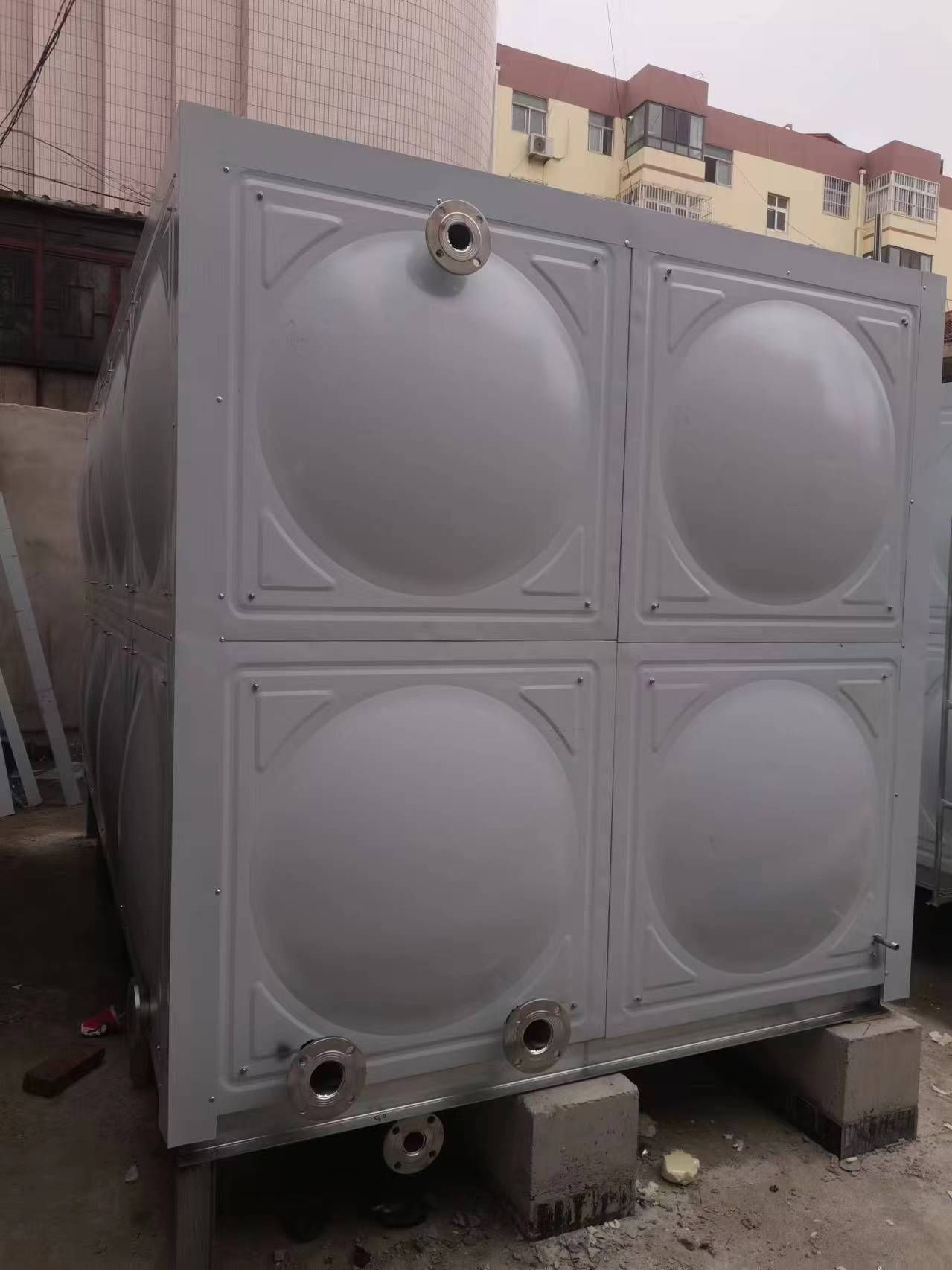 水箱內部采用304不銹鋼材質,外部采用聚氨酯加彩鋼板外殼保溫。不銹鋼水箱是由單元矩型模壓板制作而成的,通過材料變型的方法達到強度的效果,還可以任意拼裝,利用少的耗材做成完成品,這樣節能又環保。不銹鋼水箱的線型流暢,立體感好,外形美觀。