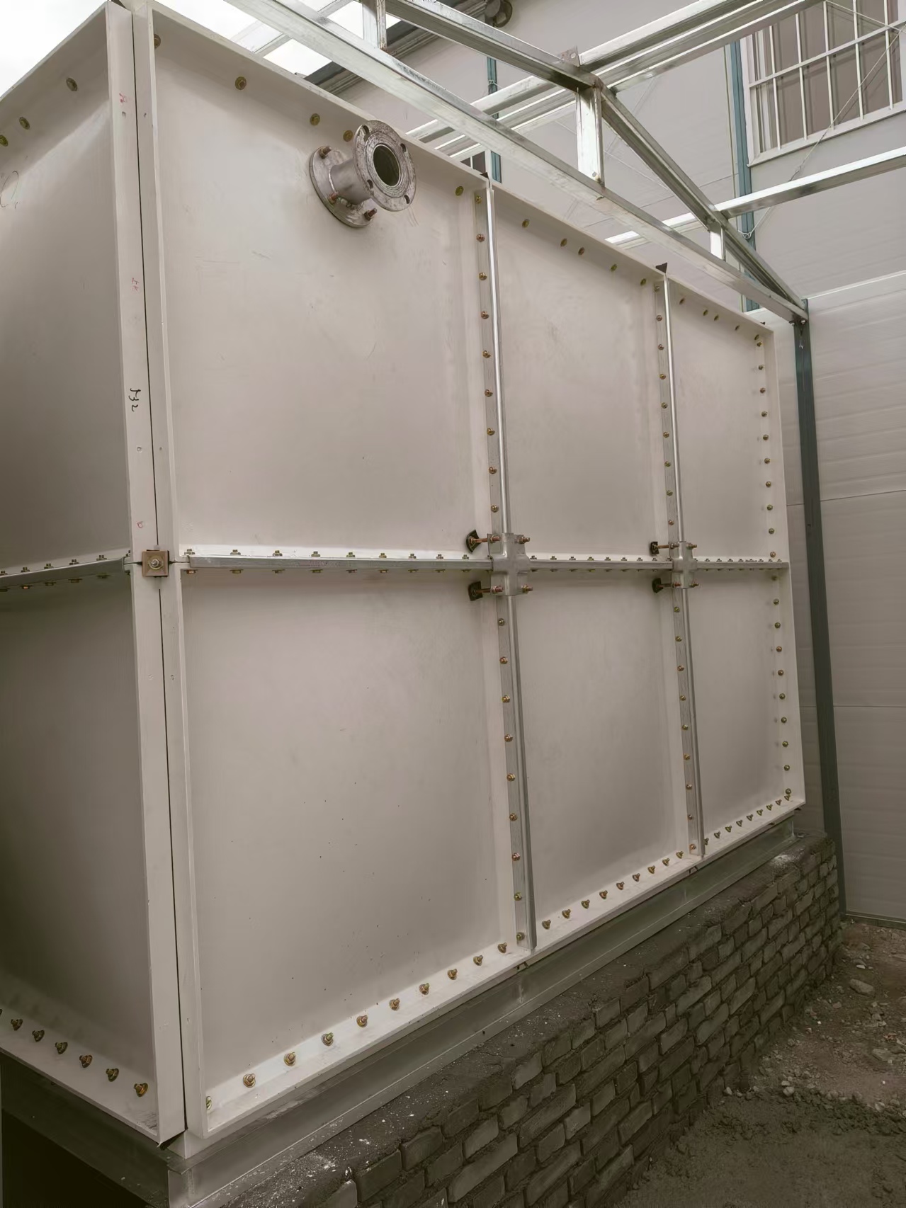 我廠承接的這臺30立方玻璃鋼水箱安裝于濟南市食鹽配送中心對過工地,用于工地臨時用消防水箱使用。現(xiàn)場照片如下: